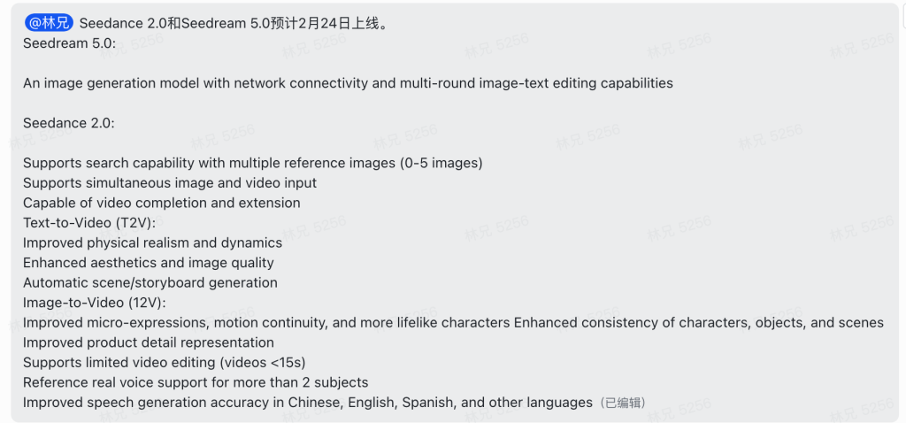 据可靠消息:字节跳动 Seed 团队即将在 2 月 24 日同时发布 Seedance 2.0 视频生成模型和 Seedream 5.0 图像生成模型,这是即梦(Jimeng)平台迄今为止最大规模的一次双模型升级。Seedance 2.0 带来了原生 2K 分辨率、多镜头叙事、多参考图输入等重磅能力;Seedream 5.0 则首次引入联网搜索和多轮图文编辑,标志着 AI 图像生成进入交互式创作时代。